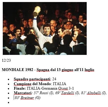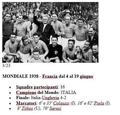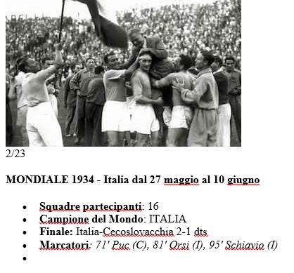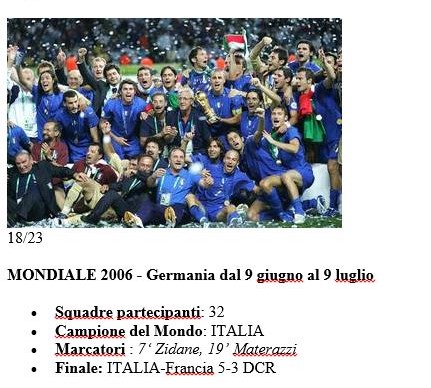 Nato nel 1930 da un idea del francese Jarles Rimet, Il campionato mondiale di calcio è il più prestigioso trofeo delle reppresentative nazionale di calcio del mondo. Il torneo è organizzato dalla FIFA. La partita finale del torneo è l'evento più seguito tra tutti gli eventi sportivi del mondo. Le edizioni sono state vinte in totale da 8 nazionali: Brasile (5 volte), Italia e Germania (4 volte, di cui le prime 3 come Germania Ovest), Argentina (3 volte), Uruguay e Francia (2 volte), Inghilterra e Spagna (1 volta). L'Italia fu tra le due finaliste per 6 volte, Fu campione del mondo per 4 volte, nel 1934, 1938, 1982, e 2006. Le altre due volte perse in finale contro il Brasile in Messico nel 1970, in tempi regolari, e in Pasedina, Caliafornia nel 1994 ai rigori per rigore che finì sulla traversa. Con le sue quattro stelle che sono seganta sulla maglia azzurra, l'Italia fa parte delle GRANDI storie del mondo calcistico mondiale. Ogni coppa mondiale ha la sua storia, i suoi grammi e le sue gioie. Nel 1934 l'Italia non era forse la squadra più technicamente superiore, Riuscì a spuntarla grazie al fattore campo di casa. Il torneo si svolse in Italia, con una piccola spinta arbitrale si aggidicò sotto gli occhi severi di Mussolini il suo primo mondiale. Nel 1938, l'allenotaro Pozzo che aveva già finto l'edizione precedente si presentò alla competizione in Francia un'Italia che era giustamente giudicata la migliore del momento vinse di nuovo il torneo. La seonda guerra mondiale pose un temine alle competizioni internazionali. Nel 1949, una tragedia aeria distrusse la squadra del Torino che era il Club che a quei tempi fino a 10 degli undici giocatori alla nazionale. Negli anni 60'e 70', l'Italia era di nuovo tra le migliore compaggine calcistiche ma si dovette attendere al 1982 per trovare il terzo tiolo in Spagna con la squadra condotta da Bearzot. Infine nel 2006, in Germania, fu la nazionale condotta da Marcello Lippi a riportate l'Italia alla prestigiosa vetta di campione del mondo di calcio.